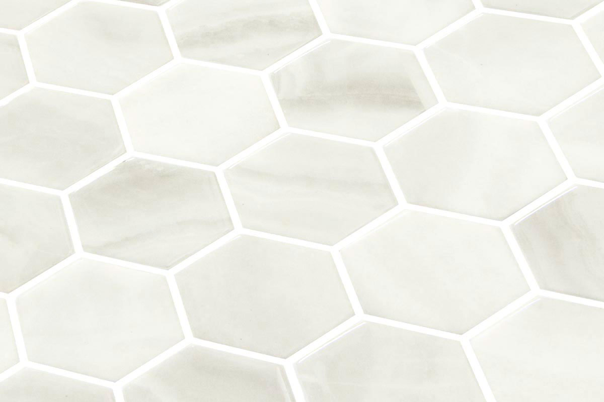 Glass mosaic, 51,6 mm, in light grey color with a gloss-matte finish. Ideal for luminous pools, it offers a luxurious and elegant design. Part of the HEX XL ONYXA series, with an exclusive gemstone effect.