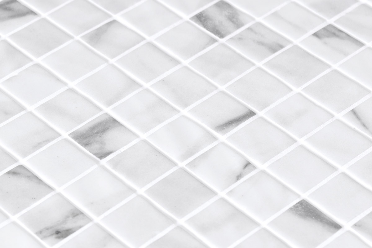 The Calacatta Matte glass mosaic is composed of 25x25mm square tiles, with the look of marble in light grey with veins in dark grey and a silky non-slip finish. A classic for floors and tiling.