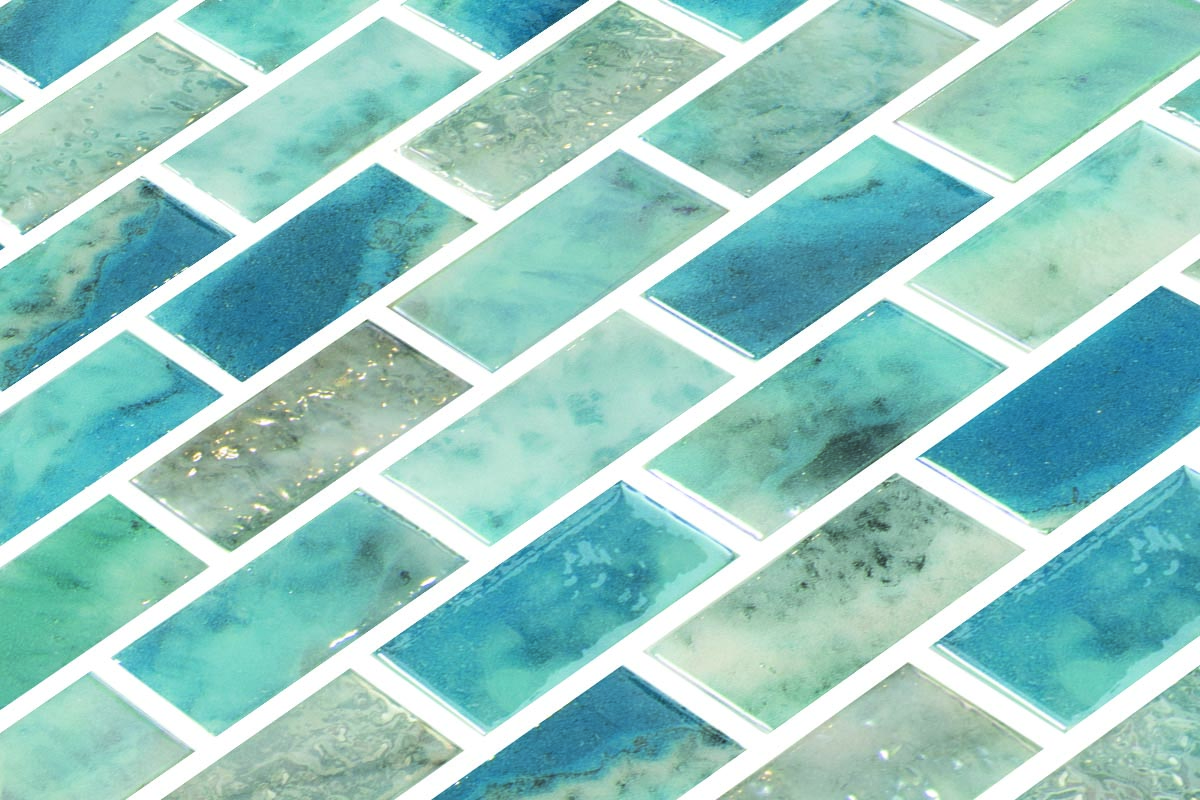 Mosaïque en verre, 25x50 mm, en bleu moyen et bleu clair avec une finition brillante-irisée. Conçue pour les piscines avec du caractère, elle propose un design élégant et exclusif. Fait partie de la série BRICK VANGUARD.