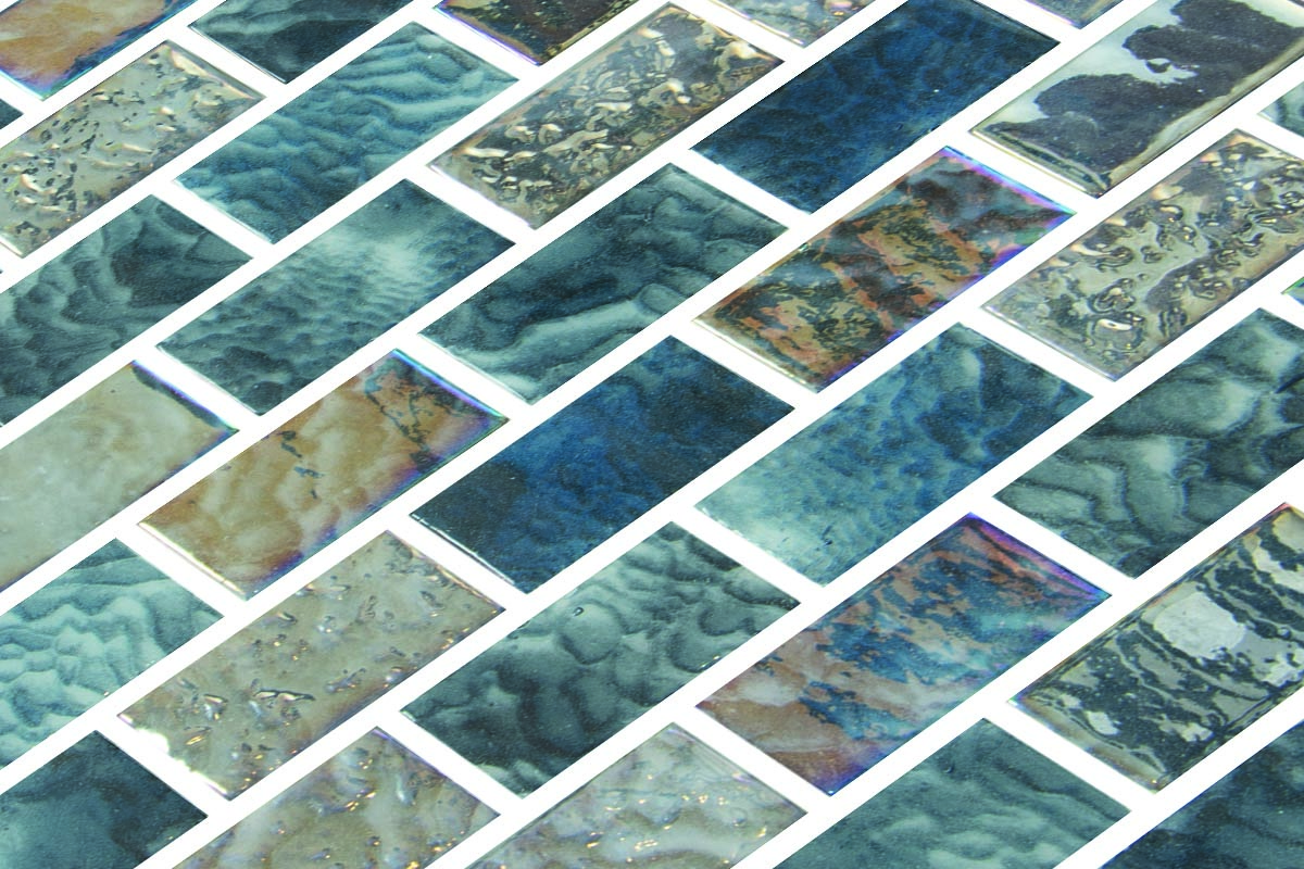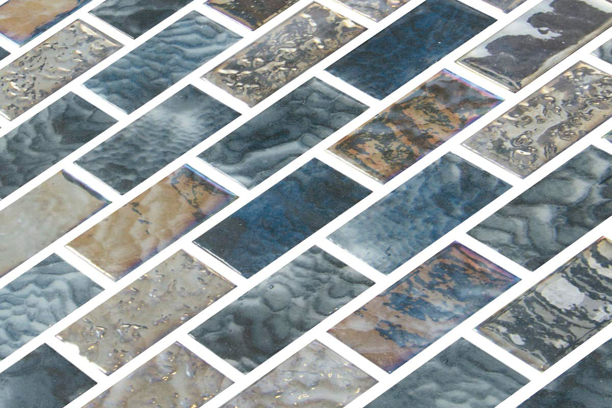 Mosaïque en verre, 25x50 mm, en bleu foncé et noir avec une finition brillante-irisée. Conçue spécialement pour l’univers de la piscine, elle offre une combinaison de reliefs et d’ondulations organiques, apportant une plus grande richesse à l’espace. De la série BRICK VANGUARD, elle joue avec la lumière et le mouvement pour créer un lieu unique.