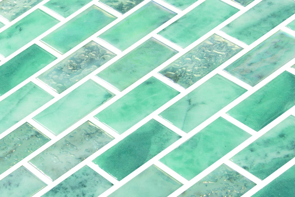 Mosaïque en verre, 25x50 mm, en bleu clair avec une finition brillante-irisée. Parfaite pour les piscines, un design unique avec des volumes qui génèrent des éclats au contact du mouvement de l’eau et de la lumière. De la série BRICK VANGUARD.