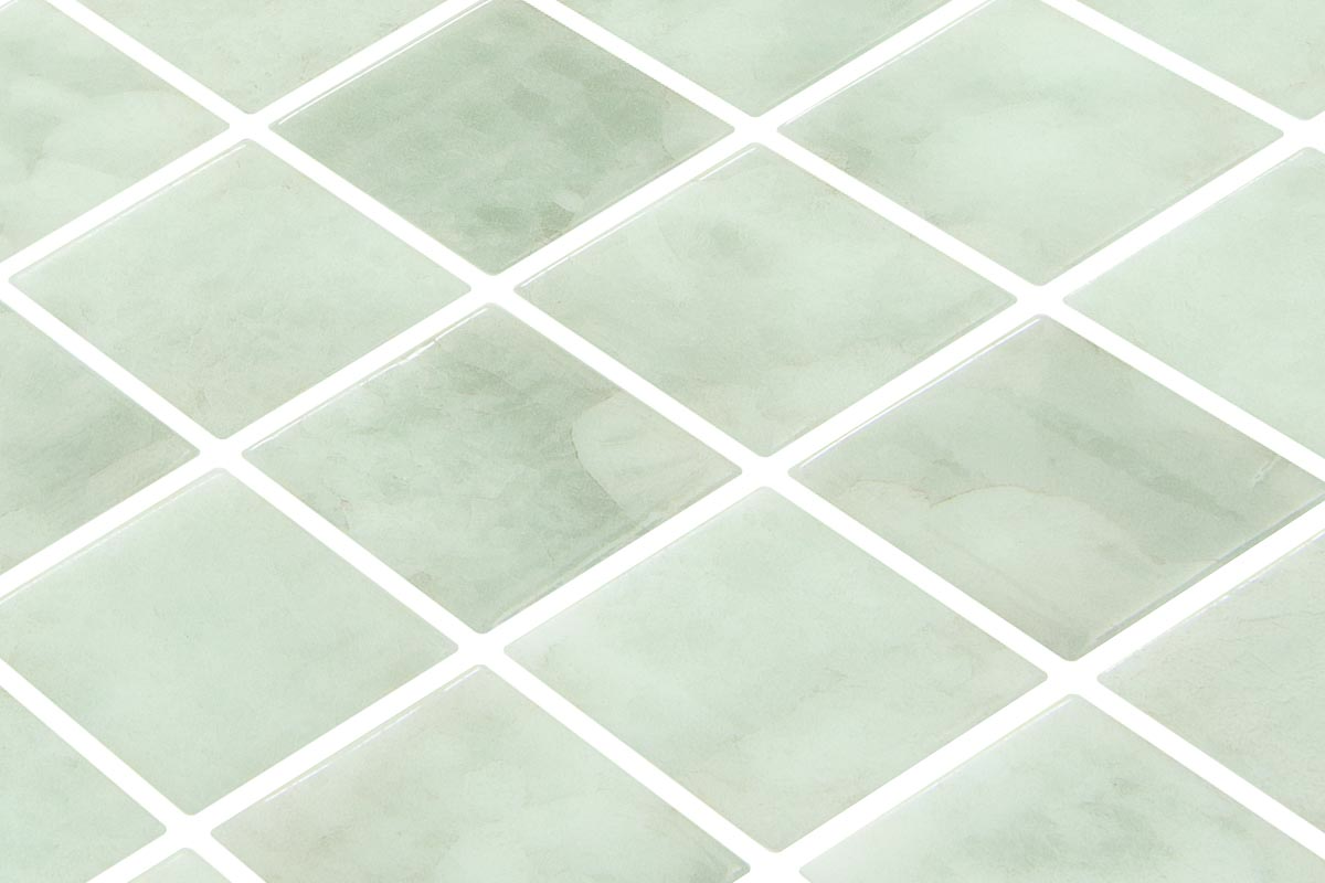 Mosaïque en verre, 50x50 mm, en gris clair avec une finition brillante-mate. Parfait pour les piscines résidentielles, un design unique inspiré du craquelé du verre artisanal. De la série PENTA CRYSTAL.