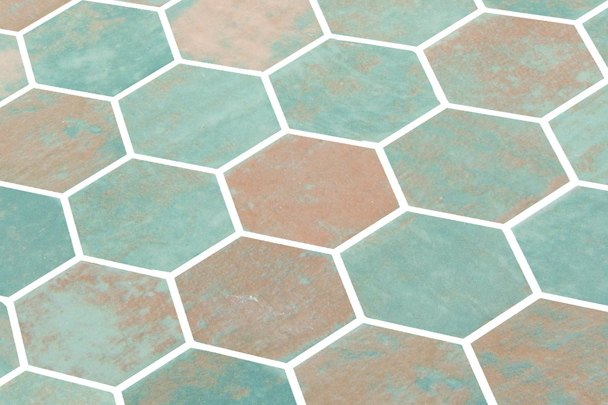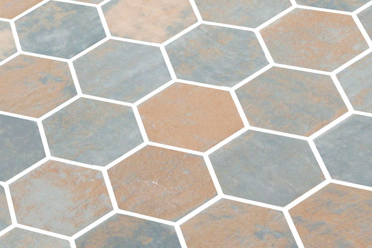 Mosaïque en verre, 51,6 mm, en bleu clair mélangé avec du brun dégradé et une finition mate antidérapante. Conçue pour les sols résidentiels, elle offre un style naturel et noble. De la série PENTA COTTIVA, alliant chaleur et design à une âme artisanale.