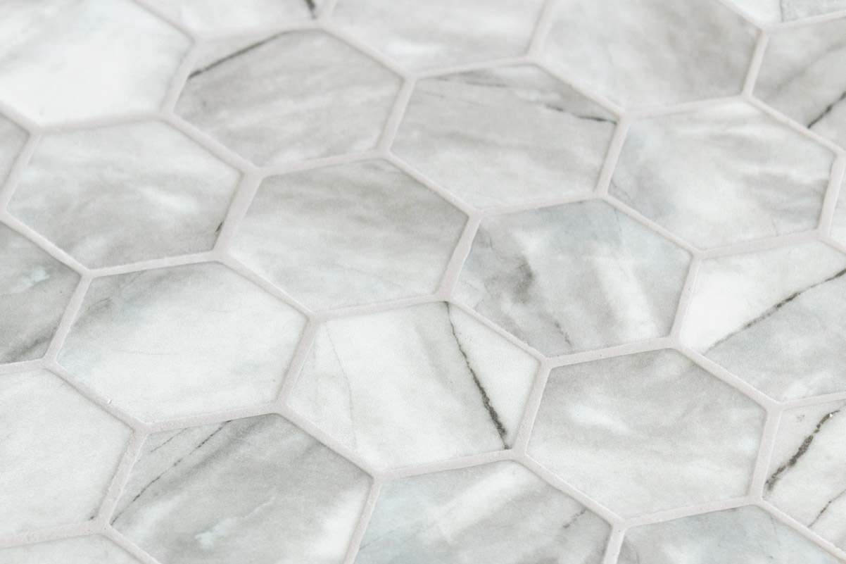 La mosaïque de verre Hex XL Inverno Grey Matte est une mosaïque de tesselles hexagonales « Hex XL » (diamètre ø 51,6 mm - 2”) de couleur grise et finition pierre antidérapante, avec des détails aux veines foncées qui accorderont de la personnalité à tout espace.
