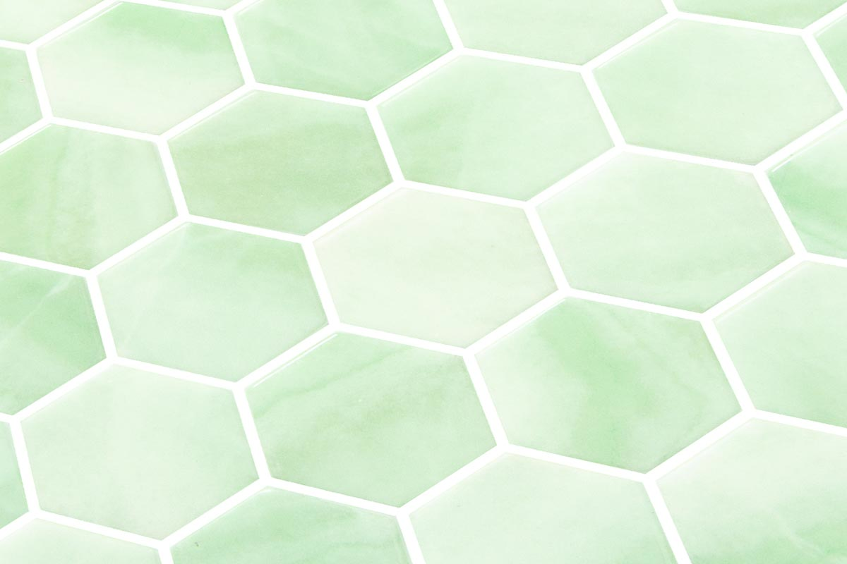 Mosaïque en verre, 51,6 mm, de couleur vert clair avec une finition brillante-mate. Conçue pour des projets résidentiels, elle offre un graphisme riche semblable à la pierre précieuse elle-même. De la série HEX XL ONYXA, elle combine sophistication et personnalité dans chaque espace.