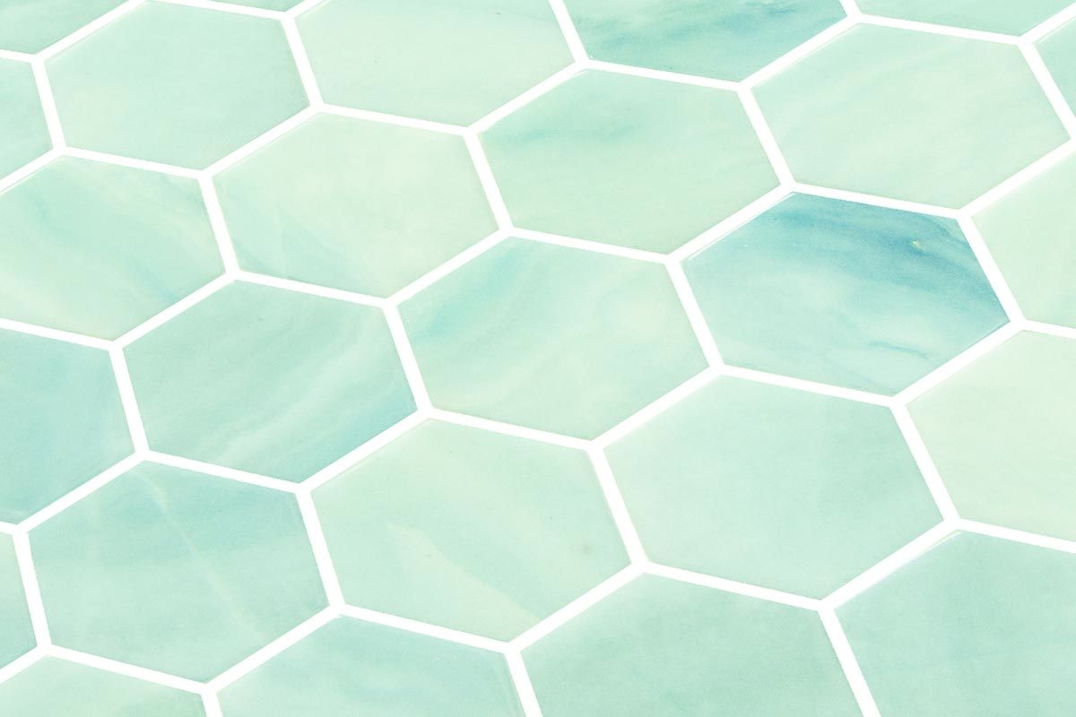 Mosaïque en verre, 50x50 mm, de couleur bleu turquoise avec une finition brillante-mate. Conçue pour des projets résidentiels, elle offre un graphisme riche semblable à la pierre précieuse elle-même. De la série HEX XL ONYXA, elle combine sophistication et personnalité dans chaque espace.