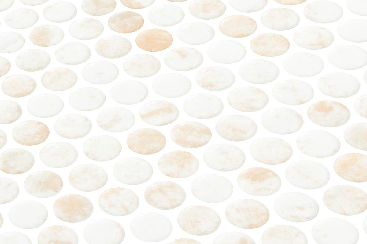 Mosaïque en verre, 19 mm, en blanc avec un effet dégradé dans les tons bruns, finition brillante-mate. Parfaite pour les sols résidentiels ou les murs extérieurs, elle allie un design intemporel à une durabilité exceptionnelle. De la série PENTA COTTIVA.