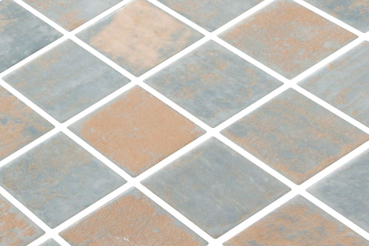 Mosaïque en verre, 50x50 mm, en bleu clair mélangé avec du brun dégradé, finition mate antidérapante. Idéale pour les murs intérieurs et extérieurs élégants, elle présente un design rustique revisité qui relie tradition et décoration. Fait partie de la série PENTA COTTIVA.