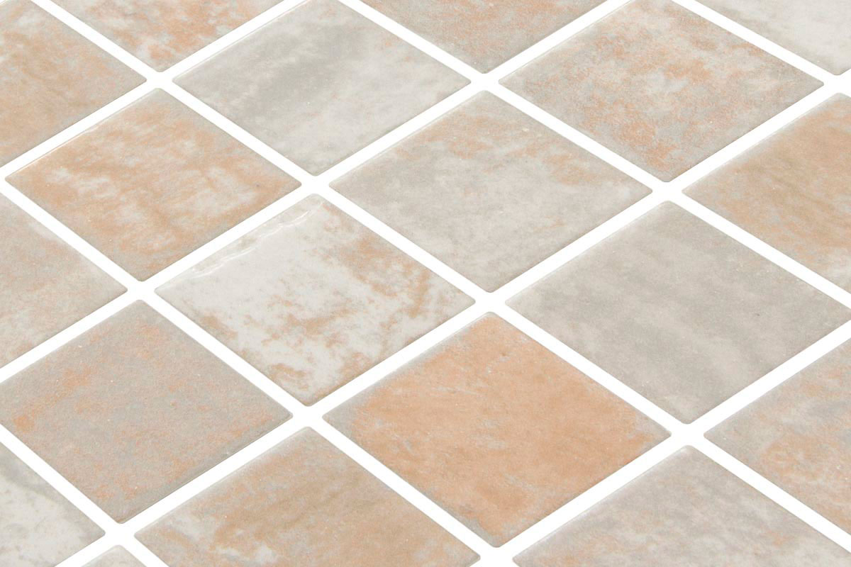 Mosaïque en verre, 50x50 mm, en gris clair avec un brun dégradé et une finition mate antidérapante. Parfaite pour les sols résidentiels ou les murs extérieurs, elle allie un design intemporel à une durabilité exceptionnelle. De la série PENTA COTTIVA.