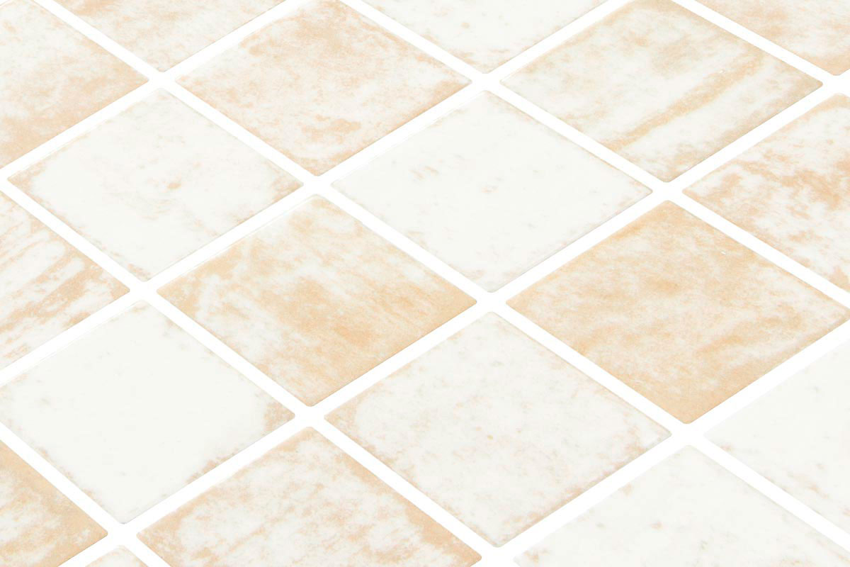 Mosaïque en verre, 50x50 mm, en blanc avec un effet dégradé dans les tons bruns, finition brillante-mate. Parfaite pour les sols résidentiels ou les murs extérieurs, elle allie un design intemporel à une durabilité exceptionnelle. De la série PENTA COTTIVA.