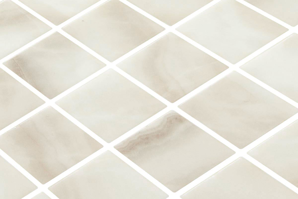 Mosaïque en verre 50x50 mm en beige avec une finition brillante-mate. Parfaite pour les sols résidentiels ou les murs extérieurs, avec un design unique inspiré de l'élégance naturelle de l'onyx. De la série PENTA ONYXA.