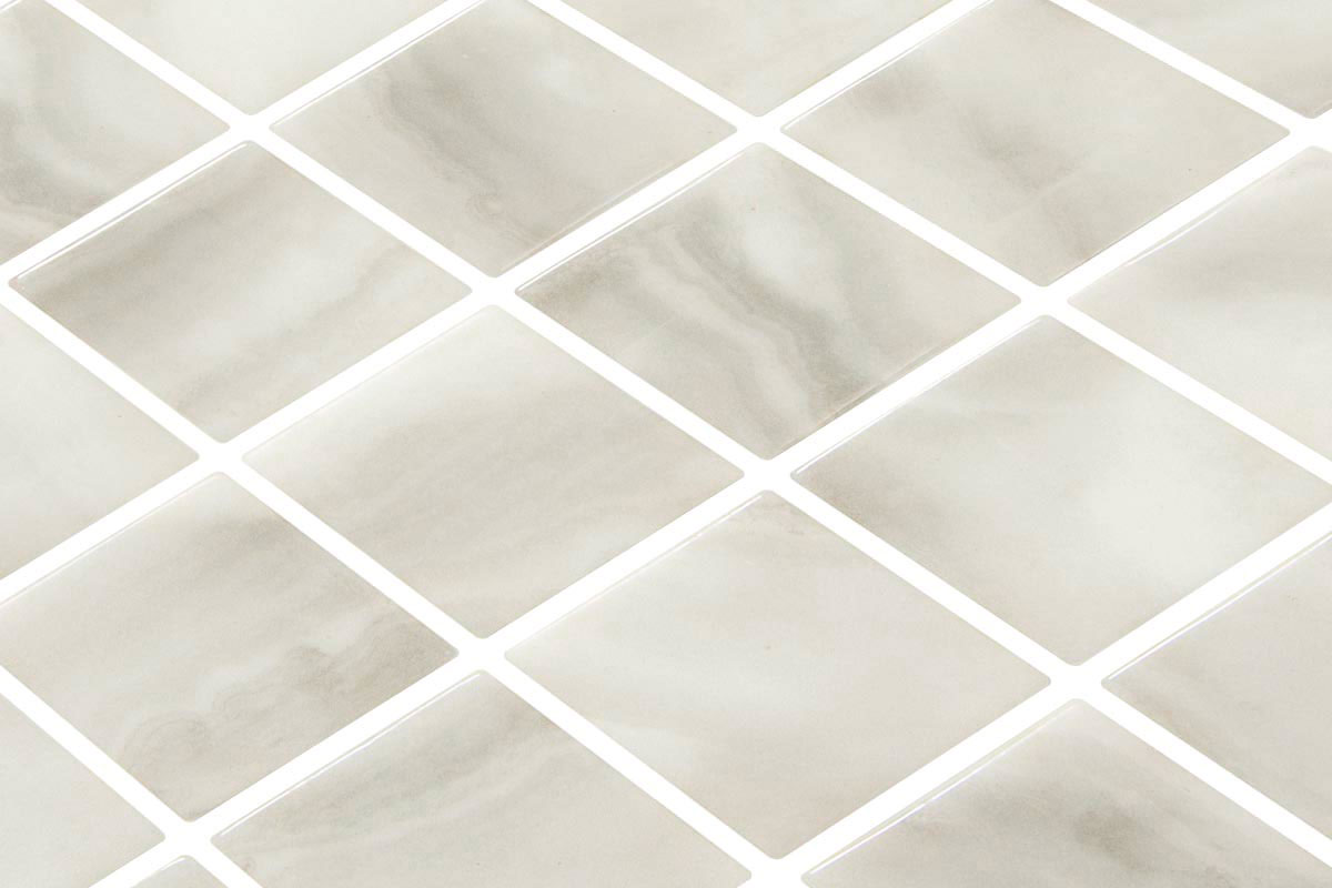 Mosaïque en verre 50x50 mm en gris clair avec une finition brillante-mate. Adaptée aux projets résidentiels dans des zones comme les murs intérieurs ou les sols, elle présente un graphisme profond avec des veines translucides, rappelant les pierres précieuses naturelles. De la série PENTA ONYXA, elle combine luxe serein et caractère dans chaque espace.